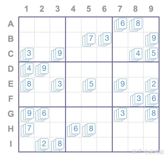 - 首先,Alice在机器中放入尚未被解决的原始数独题目,数独中的谜题卡片三张正面朝上,例如,单元格C3具有3张正面朝上的9号卡片。【即,在3行9列的位置正面朝上放三张数字9的卡片】