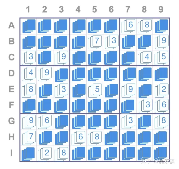 - 机器将数独中每个粗线宫(3*3)内卡片取出,并分别混淆后放入一个袋子中,一共有9个,所以9个袋子